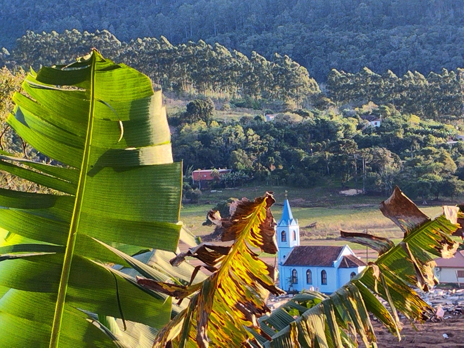 A pequena aldeia na planície do Forqueta, certamente foi afetada pela última enchente. Nota-se isso pelo lixo acumulado em alguns pontos, principalmente atrás da igreja. Há uma casa colonial de paredes verde clara, com telhado novo o que concluo pela cor de telha viva, um terracota suave e bonito. Vejo também alguns sinais de erosão e lama. A enchente é muito recente. O estrago grande.